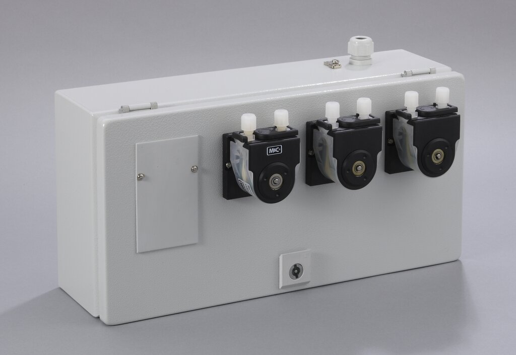 Peristaltic pump (3 pcs.) type SR25.1/Ex‑G in steel sheet protective housing, dimensions (H x W x D): 200 x 400 x 120 mm, ATEX certified version for hazardous zone 1 areas with the marking: II 2 G EEx m II T5, KEMA Nr.: 03ATEX2218x, capacity: 0.3 Nl/h, pressure range: 200 mbar to 2.2 bar abs., material: Novoprene, PVDF, tube connection: DN 4/6, with Ex terminal box cable gland M 20 x 1.5, power: 115/230 V, 50/60 Hz
