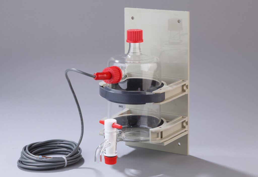 Condensate collecting vessel type TG1/LA1 with manual outlet cock and wall‑mounting bracket, including liquid alarm sensor type LA1S and electronic controller type LA1.1, capacity: approx. 1 liter, material: Duran® glass, power: 115/230 V, 50/60 Hz